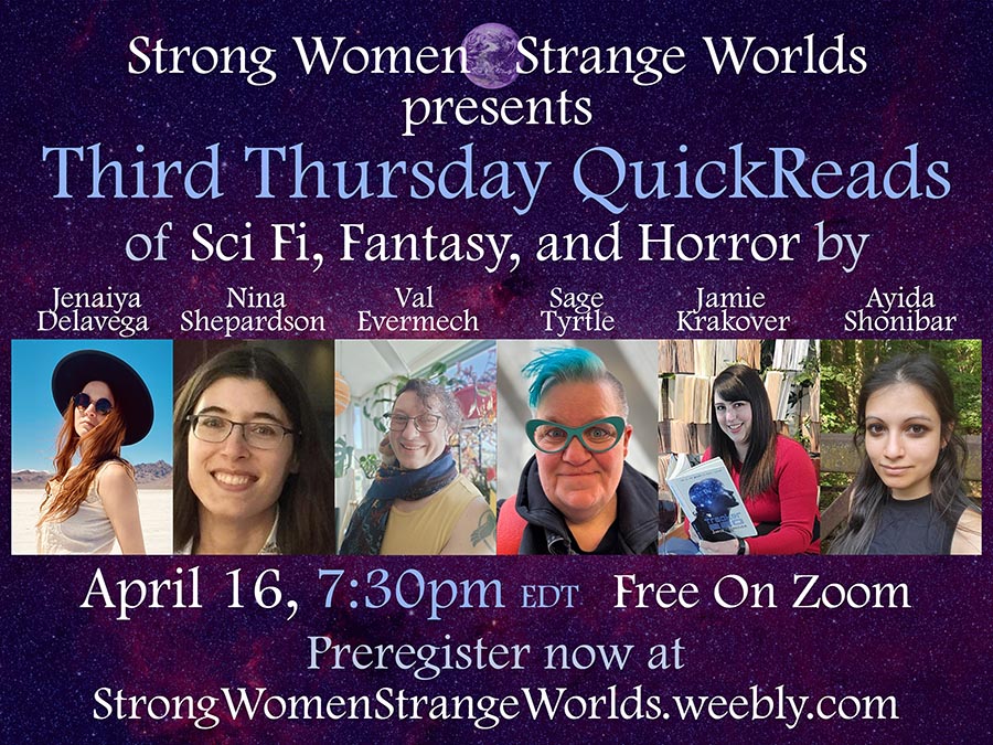 Jamie Krakover will be doing a reading from Tracker220 as part of Strong Women, Strange Worlds’ Third Thursday QuickReads series. Hosted virtually on Zoom, check out six women and nonbinary authors reading from their science fiction, fantasy, and horror novels. Each virtual event features 6 Authors, 8 Minutes Each. A tasting menu of speculative fiction delights—a fresh selection at every event. Always FREE and Open to anyone with an imagination (and an internet connection)!